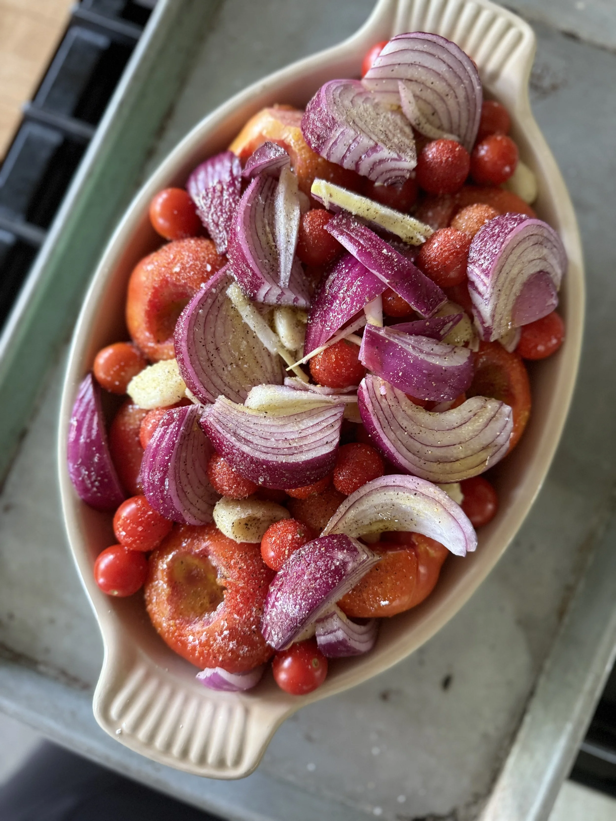These tomatoes came straight off the vine and into the baking dish. 1 hour later…sauce ( and the oven did all the work)!